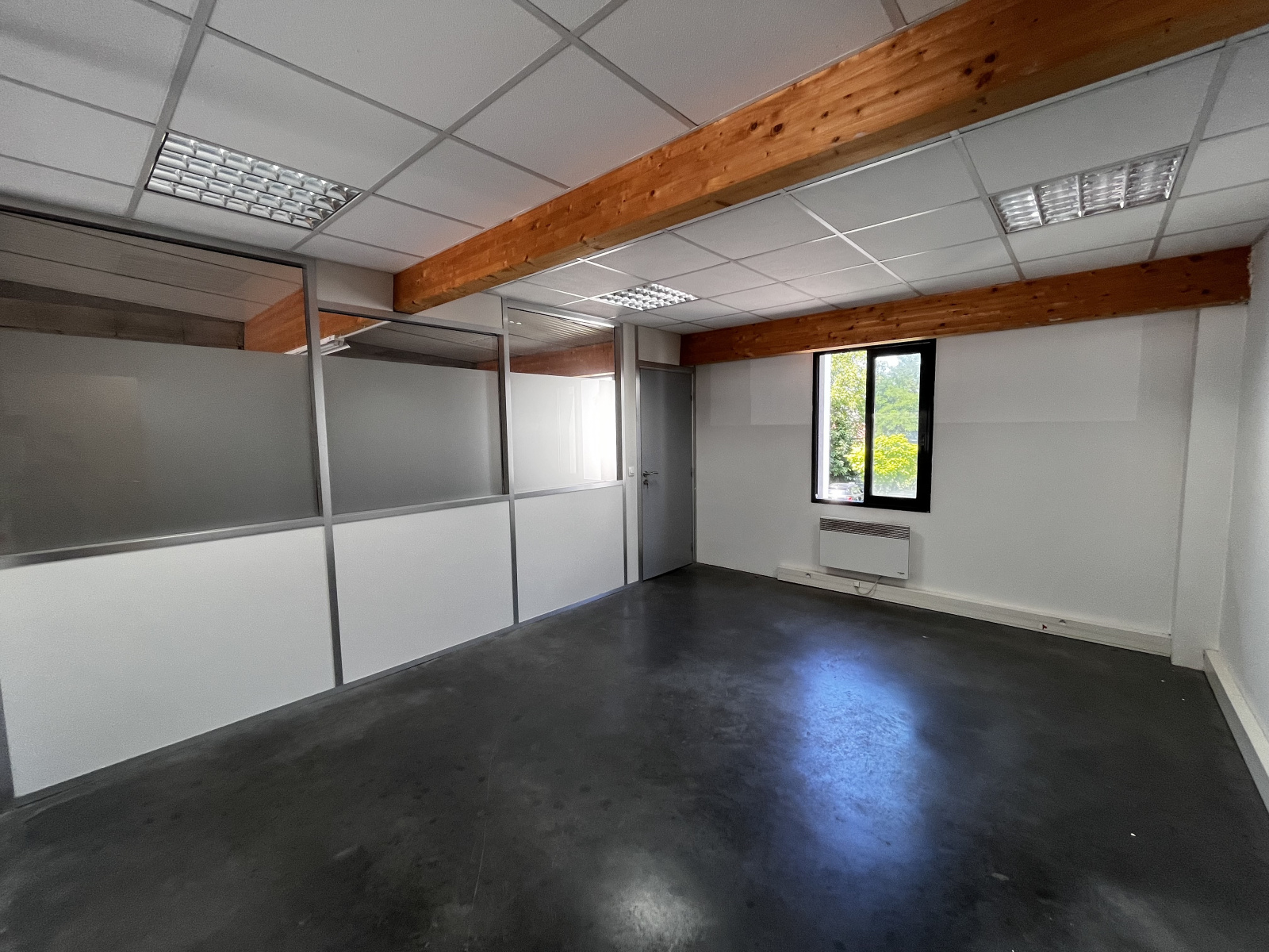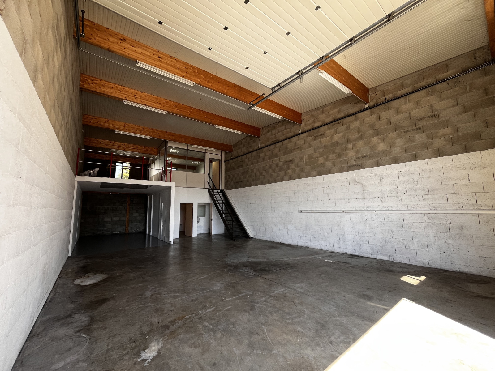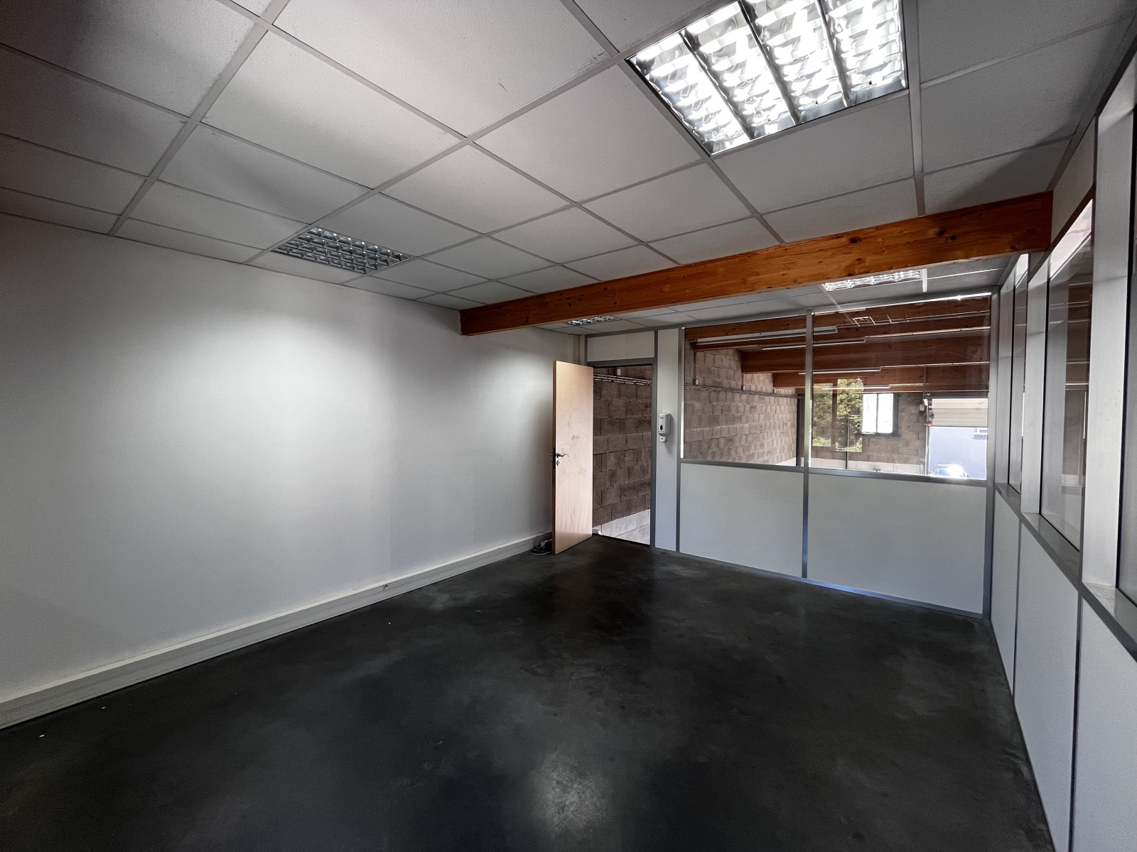 - Sols en béton quartzé industriel, menuiseries aluminium, bureau vitré
